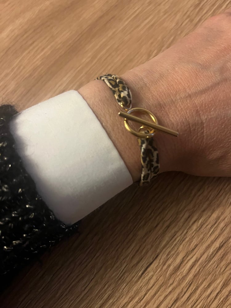bracelet en tissus imprimé léopard , réglable . fermoir Toggle en acier inoxydable doré existe en argent